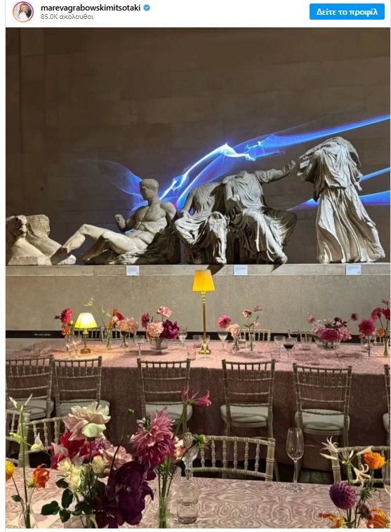 Το πρωί την καυτηρίασε η Μαρέβα Γκραμπόβσκι-Μητσοτάκη με ανάρτησή της στα κοινωνικά δίκτυα. Εβαλε φωτογραφία από τα στρωμένα τραπέζια στην αίθουσα των γλυπτών του Παρθενώνα και δεν έκρυψε τη δυσαρέσκειά της για τη διοργάνωση του φιλανθρωπικού δείπνου, κάνοντας λόγο για τουλάχιστον άστοχη απόφαση, «την ώρα που έχει ξεκινήσει ένας δημόσιος διάλογος για την επανένωση του μνημείου».