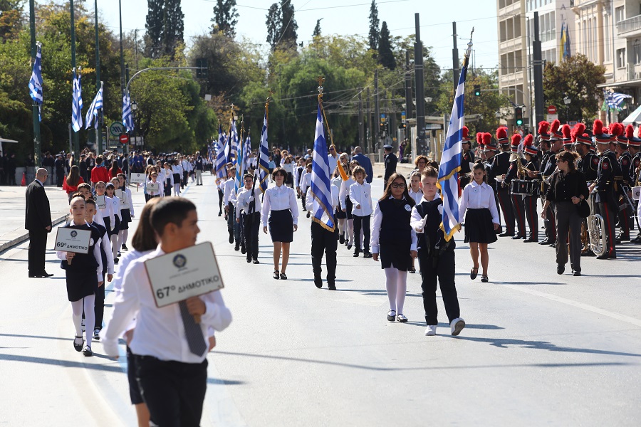Συνοδεία της φιλαρμονικής του Δήμου Αθηναίων, παρελαύνουν αντιπροσωπευτικά τμήματα μαθητών και μαθητριών όλων των σχολείων του Δήμου Αθηναίων, με τον σημαιοφόρο και πέντε παραστάτες το κάθε ένα.