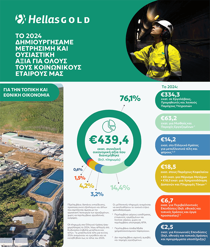 Σε μια εποχή όπου η Βιωσιμότητα δεν αποτελεί απλή δέσμευση αλλά εργαλείο μετασχηματισμού ολόκληρων κλάδων, η μεταλλευτική δραστηριότητα επικεντρώνεται ολοένα και περισσότερο στη δημιουργία αξίας για όλους τους κοινωνικούς εταίρους. Η Ελληνικός Χρυσός, ως μία ιστορική μεταλλευτική εταιρεία που αναπτύσσει τη μεγαλύτερη μεταλλευτική επένδυση $3 δισ. στα Μεταλλεία Κασσάνδρας στην Χαλκιδική, επενδύει σε ένα μοντέλο λειτουργίας όπου η οικονομική ανάπτυξη συμβαδίζει με τη διαφάνεια, τη λογοδοσία, την περιβαλλοντική και κοινωνική υπευθυνότητα. Σε αυτό το πλαίσιο, παρουσιάζει την Έκθεση Βιωσιμότητας για το 2024, αποτυπώνοντας τις επιδόσεις και προτεραιότητές της, για ουσιώδη θέματα που ενδιαφέρουν τους κοινωνικούς της εταίρους.