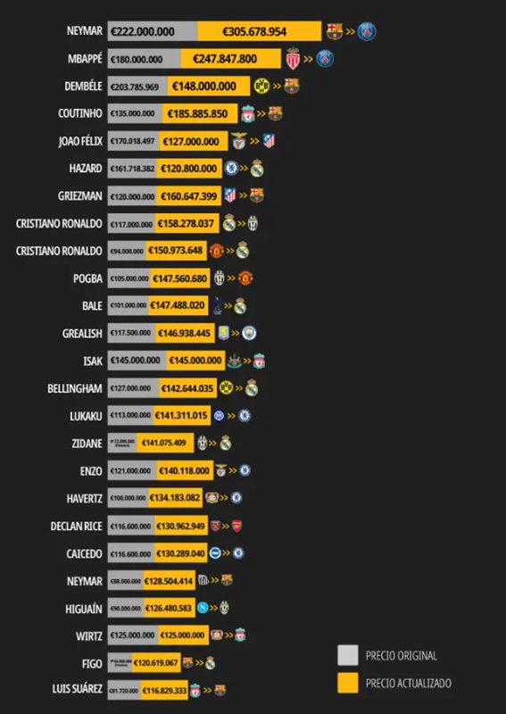 Ο Νεϊμάρ θεωρείται η πιο ακριβή στα 305.678.954-από 222.000.000 τότε-, μπροστά από τον Κιλιάν Μπαπέ (247.847.800-από 180.000.000) και τον Ντεμπελέ (148.000.000 από 203.785.969)