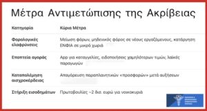 Παράλληλα, σύμφωνα με τις χειμερινές οικονομικές προβλέψεις της Ευρωπαϊκής Επιτροπής, η ελληνική οικονομία αναμένεται, αφενός να συνεχίσει να αναπτύσσεται με σχετικά ισχυρούς ρυθμούς, της τάξης του 2,2% το 2026 και, αφετέρου, ο πληθωρισμός εκτιμάται ότι θα ακολουθήσει σταδιακά πτωτική πορεία, κινούμενος στο εύρος 2,3%-2,8% τα επόμενα χρόνια. Κεντρικός στόχος της οικονομικής πολιτικής παραμένει ο περιορισμός των πληθωριστικών πιέσεων μέσω δημοσιονομικής σταθερότητας και διατήρησης πρωτογενούς πλεονάσματος, ώστε να αποφευχθούν ανισορροπίες που προκύπτουν από αυξημένη ζήτηση χωρίς αντίστοιχη ενίσχυση της προσφοράς. Τα μέχρι σήμερα μέτρα για την αντιμετώπιση της ακρίβειας περιλαμβάνουν φορολογικές ελαφρύνσεις με μείωση φόρων, μηδενικό φόρο σε νέους εργαζόμενους και κατάργηση ΕΝΦΙΑ σε μικρά χωριά, εποπτεία της αγοράς με app για καταγγελίες, ειδοποιήσεις χαμηλότερων τιμών, αλλά και λειτουργία λαϊκών αγορών από παραγωγούς, καταπολέμηση των παραπλανητικών «προσφορών» ενώ, τέλος, προβλέπουν και την στήριξη των εισοδημάτων την διετία 2026-27 με πρωτοβουλίες περίπου 2 δις ευρώ για τα νοικοκυριά.
