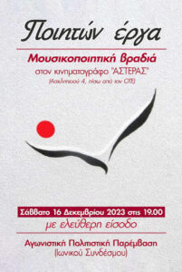 Την εκδήλωση, με τίτλο «Ποιητών έργα» οργανώνει η Αγωνιστική Πολιτική Παρέμβαση, παράταξη του Ιωνικού Συνδέσμου, και θα συνδυάσει Λόγο και Μουσική. Η είσοδος είναι ελεύθερη.